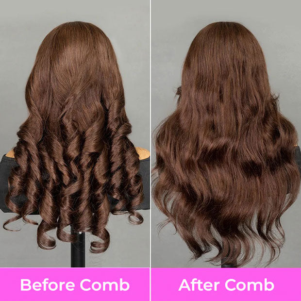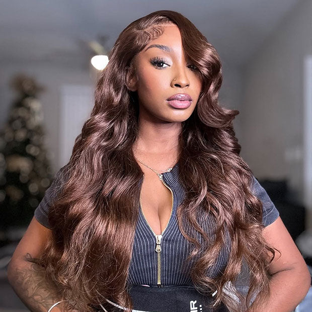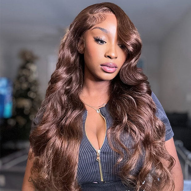 • Vshow Chocolate Brown Layered Cut Glueless Wigs Face Framing Body Wave Human Hair Wig
