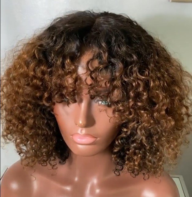 • Glueless Wig With Elastic Belt|Ombre Black to Brown Curly Wig With Bangs