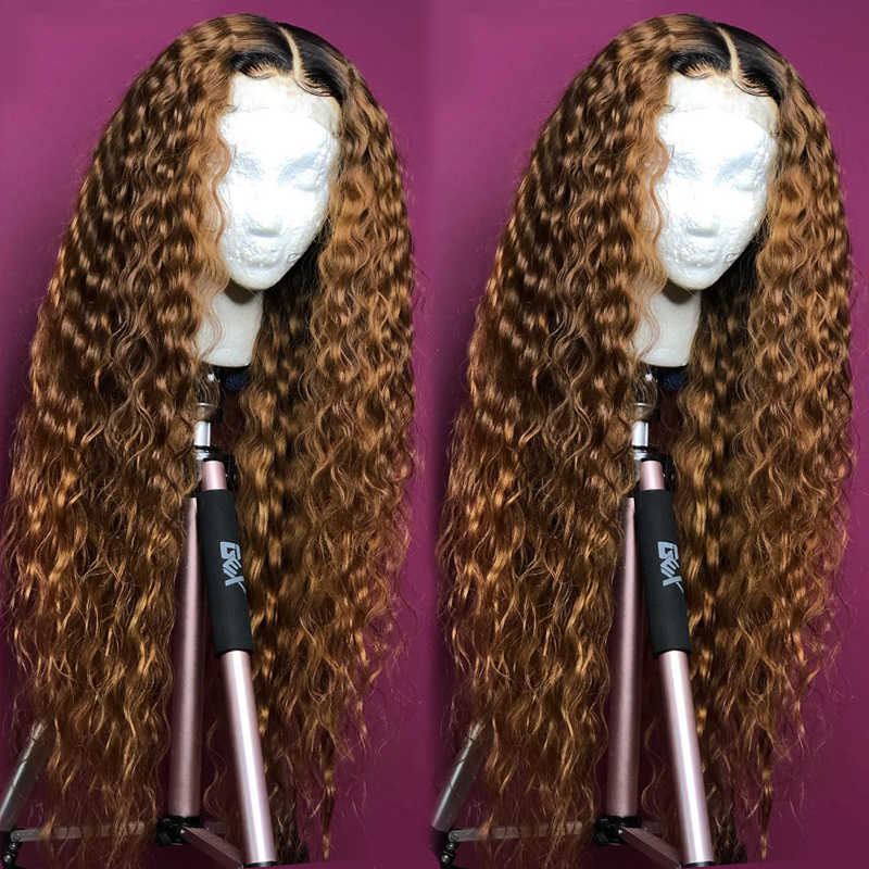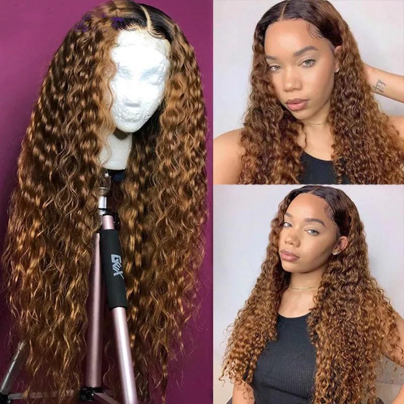 Glueless Wig With Elastic Belt|🔥4*4 Lace Closure Long Curly Human Hair Ombre Color Wigs