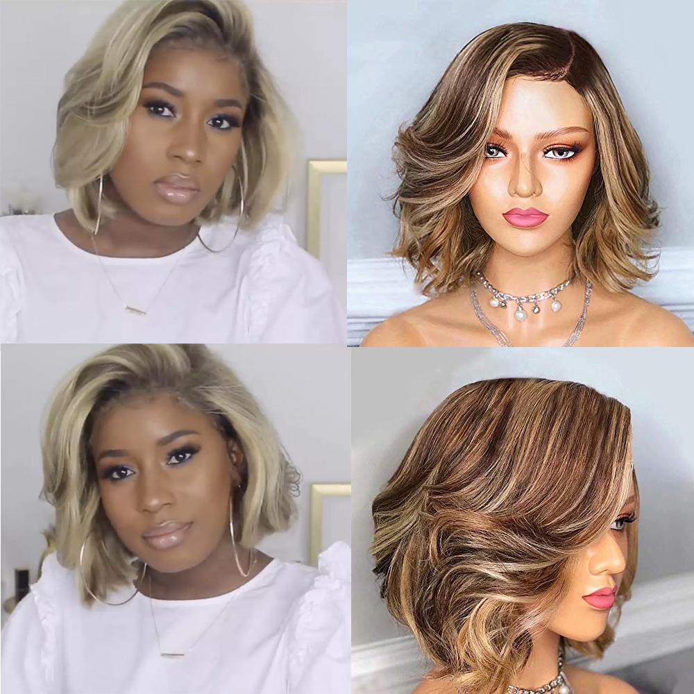 🔥Hot| Hot Sale🔥4*4 Lace Closure Glueless Black Mix Gold Short Wavy Bob Pixie Cut With Bangs